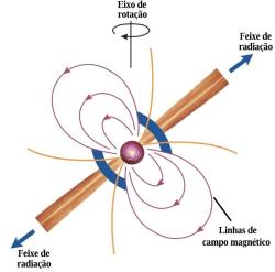 . Um pulsar é observado quando flashes regulares dos pontos quentes se observam à medida que a estrela de neutrões roda sobre si mesma. O efeito é semelhante aos flashes periódicos que se observam quando um feixe de luz se encontra em rotação num farol.