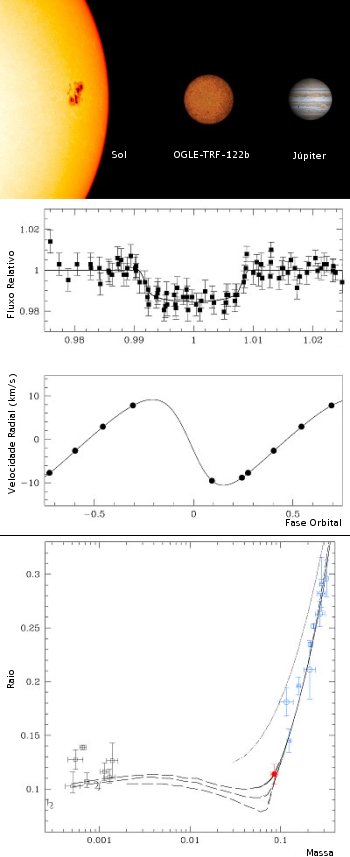 Em cima: tamanhos relativos do Sol, de OGLE-TR-122b e de Júpiter. No meio: o painel de cima mostra a diminuição de brilho de OGLE-TR-122, tal como foi medida pelo OGLE; o painel de baixo mostra a variação da velocidade radial de OGLE-TR-122, tal como foi medida pelo FLAMES, no VLT. Em baixo: relação entre a massa e o raio para estrelas de pequena massa (pontos azuis) e para planetas (pontos a preto), expressa em unidades solares; a estrela OGLE-TR-122b está indicada pelo ponto vermelho; as várias linhas representam modelos teóricos calculados por G. Chabrier e colegas. Crédito: ESO.