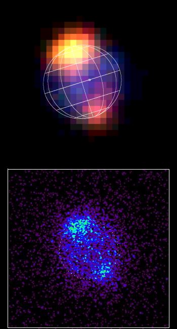 Em cima: imagem de Júpiter, pelo XMM-Newton, mostra a distribuição das energias dos raios-X: as energias mais baixas estão a vermelho, as mais elevadas a azul, e as intermédias a verde. A quadrícula indica a orientação de Júpiter na altura das observações. Crédito: Branduardi-Raymont et al. 2004. Em baixo: imagem de Júpiter, pelo XMM Newton, mostrando as zonas das auroras (azul claro) e os raios-X do disco (mais escuro). Crédito: ESA.