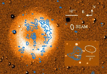 Imagem do Objecto de Sakurai, no rádio e no óptico. A imagem a cores mostra a nebulosa ejectada há milhares de anos. Os contornos indicam a emissão rádio. O detalhe, à direita, é uma imagem da parte central da região, obtida pelo Telescópio Espacial Hubble (NASA/ESA), e sobre a qual se desenharam os contornos indicando a emissão rádio. Crédito: Hajduk et al., NRAO.AUI/NSF, ESO, StSci, NASA.