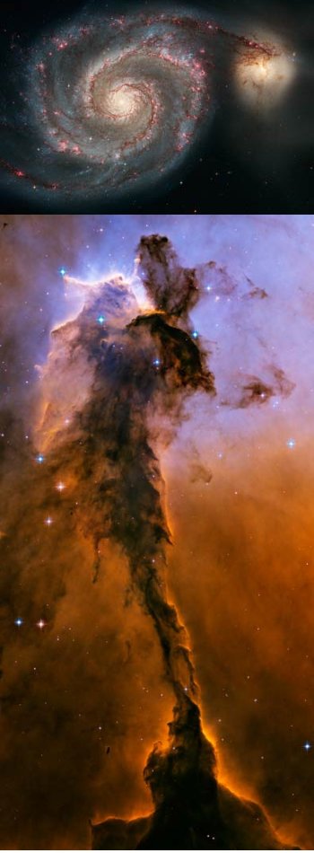 Imagens de alta resolução, obtidas com a câmara ACS do Hubble, comemorando os 15 anos em órbita do telescópio: em cima, a galáxia Remoinho (M 15) e a sua companheira NGC 5195, e em baixo, um pilar de gás frio na nebulosa da Águia (M 16). Crédito: NASA/ESA/S. Beckwith (STScI) & the Hubble Heritage Team (STScI/AURA).