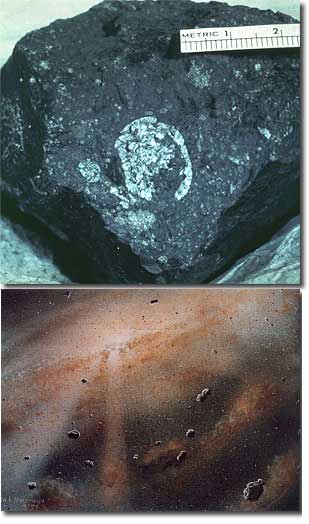 Em cima: os investigadores analisaram a inclusão rica em cálcio e alumínio (CAI) – a larga zona circular no centro da imagem – e o côndrulo - o pequeno objecto circular do lado esquerdo - existentes em duas áreas da superfície deste meteorito primitivo, o Allende. Crédito: Lawrence Livermore National Laboratory. Em baixo: esta concepção artística da nebulosa solar mostra a região da Terra menos de um milhão de anos depois de o Sol se ter formado; pequenos grãos de poeira colidiram para formar pequenos objectos, que depois colidiram para formar os planetas. Crédito: William K. Hartmann/PSI.