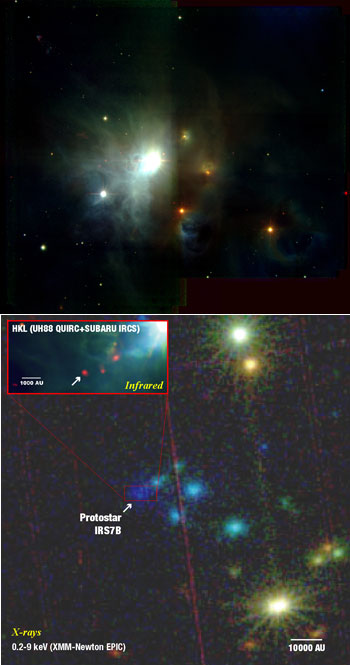 Em cima: Imagem da região de formação estelar R Corona Australis, a cerca de 500 anos-luz da Terra, obtida, no infravermelho próximo, pelo telescópio de 88 polegadas da Universidade do Havai. São visíveis muitas proto-estrelas (a vermelho) e estrelas jovens (branco brilhante). Crédito: UH88 / Nedachi et al. Em baixo: Imagem mais aberta de R Corona Australis, em raios-X, obtida pelo telescópio XMM-Newton. As seis fontes azuis são proto-estrelas (a maior parte correspondendo aos pontos vermelhos da imagem de cima). À proto-estrela de Classe 0 estudada pela equipa foi dado o nome de IRS7B. Embora não seja obviamente visível na imagem de cima, esta proto-estrela estaria à esquerda da fonte brilhante central dessa imagem. IRS7B surge ainda em infravermelho na imagem ampliada. Credito: ESA/XMM/Subaru/UH88.