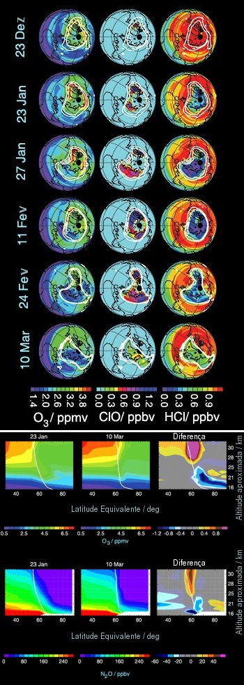 Em cima: Mapas obtidos pelo Microwave Limb Sounder do Aura mostram as alterações nas concentrações de ozono (O3), monóxido de cloro (ClO) e de cloreto de hidrogénio (HCl), para os dias seleccionados de 2004-2005, do Inverno árctico. Em baixo: O Microwave Limb Sounder do Aura mede o óxido nítrico (N2O), que não é afectado pelos processos químicos da estratosfera. Através do estudo das variações dos níveis deste composto, os cientistas podem entender melhor de que forma o ar se movimenta e qual a influência desses movimentos nas concentrações de ozono (O3). Assim é possível distinguir as alterações para os níveis de ozono que daí resultam daquelas que são efectivamente provocadas pela sua destruição química. Crédito: NASA/JPL.