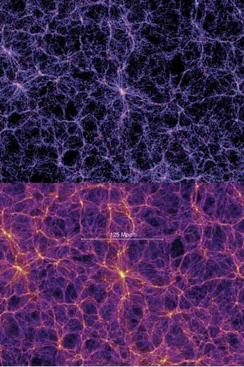 Em cima: a distribuição da luz em larga escala, na simulação. Em baixo: as correspondentes distribuições de matéria escura. Credito: Springel et al.