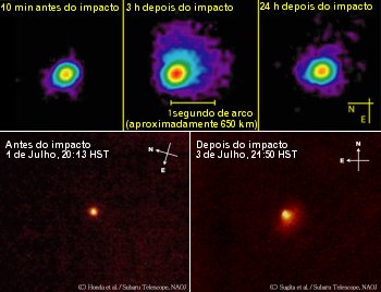 Em cima: imagens no infravermelho intermédio (11,6 µm), em em falsa cor, do cometa Tempel 1, antes e depois do impacto, obtidas com a câmara Michelle, no Telescópio Gemini Norte. Crédito: Gemini Observatory/AURA. Em baixo: imagens no infravermelho intermédio, a 10,5 µm, dois dias antes do impacto e duas horas após o impacto, obtidas com a câmara COMICS, no Telescópio Subaru. Crédito: Honda et al./Subaru Telescope, NAOJ (esq.); Sugita et al./Subaru Telescope, NAOJ (dir.).