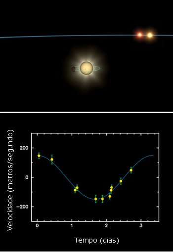 Em cima: concepção artística do sistema triplo de estrelas e da órbita do planeta HD 188753 Ab. Em baixo: variação da velocidade radial da estrela HD 188753 A, indicando a presença de um planeta à sua volta. Crédito: NASA/JPL-Caltech.
