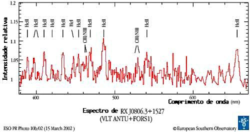 Espectro do sistema RX J0806.3+1527 obtido com o instrumento FORS1 no telescópio ANTU (VLT-ESO). A presença de muitas linhas de emissão de hélio ionizado (He II), algumas de carbono e azoto duplamente ionizados (C III e N III), testemunham a temperatura extremamente elevada à superfície das estrelas do sistema. Crédito: ESO.