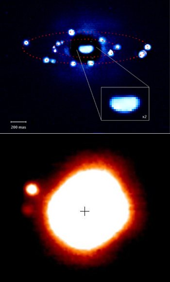 Em cima: imagem composta, mostrando posições sucessivas dos dois satélites de 87 Sylvia (Romulus e Remus) em nove noites diferentes, entre Agosto e Outubro de 2004. O asteróide principal, 87 Sylvia, é visto ampliado. Em baixo: uma das imagens da descoberta, obitda a 9 de Agosto de 2004, na banda K. Crédito: Marchis et al., 2005, Nature, UCB/IMCCE-Observatoire de Paris.