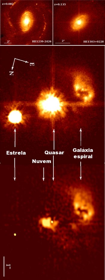Em cima: exemplo de dois quasares estudados, onde se pode observar a galáxia hospedeira. As imagens foram obtidas pelo Hubble. Em baixo: imagem do quasar HE0450-2958, obtida pelo Hubble. Não se observa qualquer galáxia hospedeira, apenas se pode ver uma galáxia companheira com grande actividade de formação estelar, perto do topo da imagem. Por baixo, a mesma imagem após a aplicação do método de deconvolução MCS. Em contraste com os restantes, este quasar não aparece no centro de uma galáxia hospedeira, mas na fronteira de uma estrutura compacta de gás ionizado pela radiação do próprio quasar. Este gás pode ter sido capturado durante uma colisão com a galáxia que apresenta o surto de formação estelar. A estrela que se vê na imagem é uma estrela da nossa galáxia que se encontra na linha de visão. Crédito: ESO.