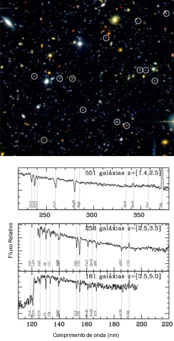 Em cima: pequena região do céu (3 x 3 minutos de arco) observada no âmbito do levantamento VVDS. A imagem, obtida pelo Telescópio Canadá-França-Havai, tem indicada as 13 galáxias distantes descobertas nesta região. Crédito: Megacam/CFHT, ESO. Em baixo: as 970 galáxias distantes descobertas foram divididas em três grupos segundo o seu desvio para o vermelho – [1,4:2,5], [2,5:3,5] e [3,5:5,0] – e em cada grupo, os seus espectros foram combinados. Crédito: VIMOS/VLT, ESO.