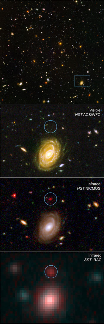 De cima para baixo: 1-A galáxia HUDF-JD2 foi localizada entre outra 10000, numa pequena área do céu, o Campo Ultra Profundo do Hubble (HUDF), que é a mais profunda imagem do Universo alguma vez conseguida nos comprimentos de onda do visível e do infravermelho próximo. 2-Uma ampliação de uma pequena área do HUDF, usada para a localização da galáxia. A luz visível da galáxia foi absorvida durante uma viagem de milhares de milhões de anos através de um meio intermédio de hidrogénio gasoso. 3-A galáxia foi detectada usando a câmara NICMOS do Hubble, mas nos comprimentos de onda do infravermelho próximo surge muito ténue e vermelha. 4-O array de infravermelhos do Spitzer detectou facilmente a galáxia em maiores comprimentos do infravermelho. O IRAC é sensível à luz das estrelas mais velhas, vermelhas, que constituem a maior parte da massa da galáxia. O brilho sugere uma massa bastante elevada. Crédito: NASA, ESA, B. Mobasher (STScI/ESA).