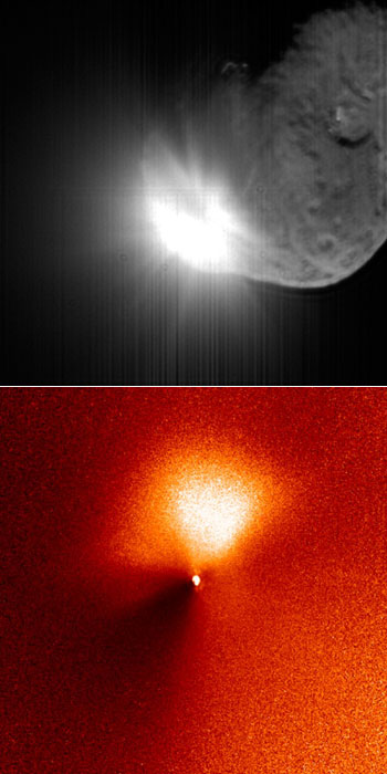 Em cima:Esta imagem mostra o material ejectado pelo cometa Tempel 1, resultado da colisão com o impactor da Deep Impact. A imagem foi obtida pela câmara de alta resolução (HRI) a bordo da nave principal, 13 segundos após o impacto. Crédito: NASA/JPL-Caltech/UMD. Em baixo: Imagem obtida pelo Hubble, a 14 de Junho de 2005, que mostra uma explosão no Tempel 1. A imagem revela um jacto estendendo-se por 2200 Km e apontando na direcção do Sol. Crédito: NASA, ESA, P. Feldman (Johns Hopkins University), and H. Weaver (Johns Hopkins University/Applied Physics Lab).