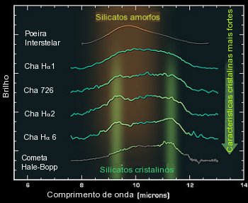 Este gráfico mostra os espectros dos discos de poeira à volta das anãs castanhas Cha Hα 1, Cha 726, Cha Hα 2 e Cha Hα 6. Para comparação, em cima encontra-se um espectro da poeira interstelar, e em baixo, um espectro do cometa Hale-Bopp, constituído por cristais de silicatos. As bandas verdes verticais indicam a localização, no espectro, das riscas características do mineral olivina. Verifica-se que três das quatro anãs castanhas, para além do cometa, possuem este mineral. Quanto mais largas são estas riscas, maior o tamanho dos grãos de silicatos – os objectos estão por ordem crescente do tamanho dos grãos. Estas características dos espectros levam os astrónomos a pensar que a poeira à volta destas anãs castanhas está a cristalizar e a formar grumos, que com o tempo, poderá formar planetas. Crédito: NASA/JPL-Caltech/D. Apai (University of Arizona).