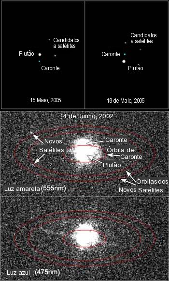 à volta de Plutão. Os candidatos a satélites, designados provisoriamente por S/2005/P1 e S/20005/P2, têm diâmetros entre 64 e 200 km e foram observados a cerca de 44 000 km de Plutão, o que corresponde entre duas a três vezes a distância a que Caronte se encontra do planeta.