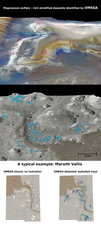 Os dados obtidos pelo OMEGA levam os cientistas a concluir que os depósitos de sulfatos se formaram depois dos filossilicatos. Para se formarem, os sulfatos não precisam de uma presença constante de água líquida, mas a água deve estar presente e ter um carácter ácido.