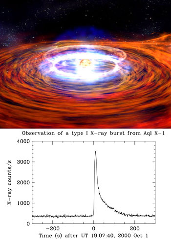 Em cima: Imagem extraída de uma animação de uma fulguração de raios-X proveniente de uma estrela de neutrões. Crédito: NASA/Dana Berry. Em baixo: Uma estrela de neutrões pode exibir regularmente fulgurações de raios-X, como se pode ver por este gráfico. As fulgurações são provocadas pela ignição do gás à superfície da estrela. Nos buracos negros não há fulguração, pois o gás que a poderia provocar parece desaparecer para lá do horizonte de eventos. Crédito: Remillard, et al.