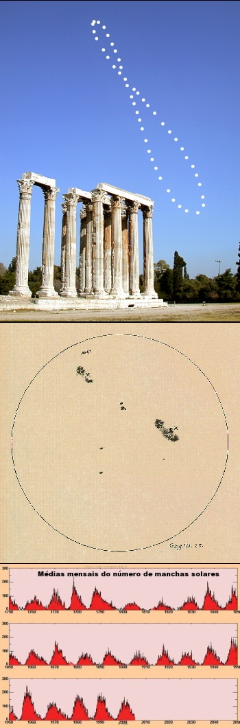 Em cima: analema sobre o Templo Olímpico de Zeus, Atenas, obtido às 12:00 (hora local) de 20 de Março, 2003, a 24 de Março, 2004. Crédito & Copyright: Anthony Ayiomamitis. No centro: desenho das manchas solares do dia 23 de Junho de 1613, por Galileu Galilei. Em baixo: gráfico que ilustra a média mensal do número de manchas solares desde 1750 até 2004.