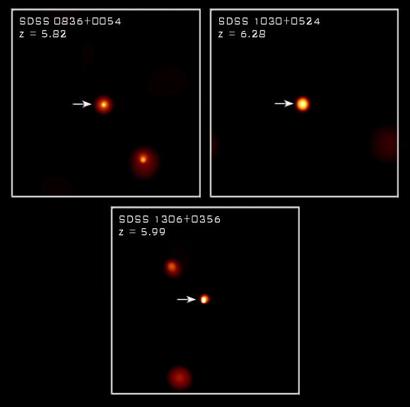 ). Estima-se que estes quasares se encontrem a uma distância de 13 mil milhões de anos-luzO levantamento do céu SDSS é um projecto que tem por objectivo mapear detalhadamente um quarto de todo o céu, determinando posições e magnitudes absolutas de 100 milhões de objectos celestes, e determinando ainda a distância a mais de 1 milhão de galáxias e quasares. Os telescópios que participam neste projecto estão situados no Observatório de Apache Point (EUA). O SDSS é um projecto conjunto de instituições norte-americanas, alemãs e japonesas.