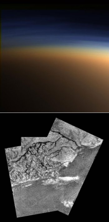 Em cima: a alta atmosfera de Titã, onde as moléculas de metano são destruídas pela luz ultravioleta. A Cassini obteve várias exposições com os filtros vermelho, verde e azul, que, combinadas, criam esta fotografia de cor natural. Crédito: NASA/JPL/Space Science Institute. Em baixo: detalhe da superfície de Titã, onde se vêem estruturas que parecem canais de rios. Mosaico de três imagens obtidas pela Huygens. Crédito: ESA/NASA/JPL/University of Arizona.