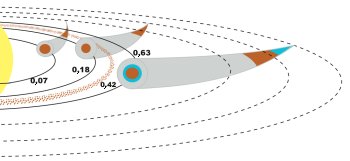 Ilustração do possível processo de formação e actual estrutura do sistema planetário à volta da estrela HD 68930. Os três planetas formam-se a distâncias indicadas pelas elipses a tracejado; as elipses a cheio indicam a actual localização das suas órbitas. Os dois planetas interiores formam-se mais próximo da estrela que a linha de gelo, e por isso a sua matéria-prima são planetesimais rochosos e gás - estes planetas consistem num núcleo rochoso (a castanho) envolto numa atmosfera (a cinzento). O planeta mais longínquo formou-se para lá da linha de gelo e por isso acumulou gelo - o planeta consiste num núcleo rochoso (a castanho) envolto em gelo (a azul), com uma espessa atmosfera (a cinzento). Também estão indicadas as distâncias à estrela, em UA (1 UA = distância Terra-Sol).