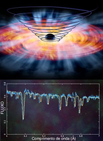 Em cima: Ilustração dos campos magnéticos que podem produzir o vento observado em GRO J1655-40. A pressão criada pelos campos magnéticos pode levar o gás a subir e sair do disco, resultando o vento detectado pelo Chandra. Crédito: NASA/CXC/M.Weiss. Em baixo: o desfasamento do espectro observado em raios-X de GRO J1655-40 (a azul) relativamente ao esperado (a amarelo) é causado pelo efeito de Doppler, o que mostra que o gás está em movimento na nossa direcção. Crédito: NASA/CXC/U.Michigan/J.Miller et al.