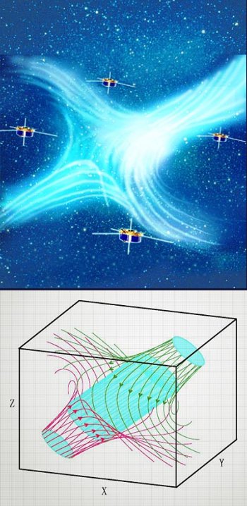 Em cima: visão artística da constelação de satélites Cluster cercando uma região magnética nula. Em baixo: diagrama da estrutura espiral do campo magnético à volta de um ponto nulo, baseado nos dados do Cluster. O ponto nulo é uma região tridimensional onde os campos magnéticos se quebram e reconectam. Crédito: Dr. Xiao/Chinese Academy of Sciences (Beijing).