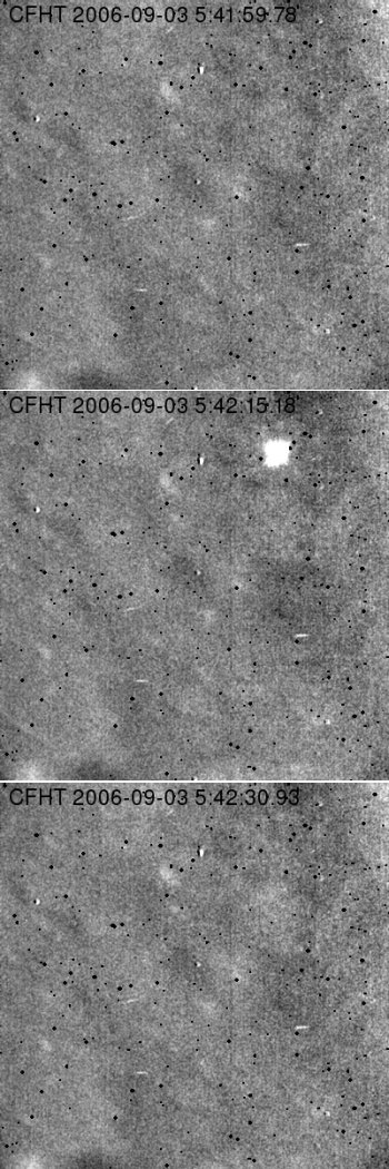 Sequência de imagens no infravermelho (2122 nm) pela WIRCam do telescópio CFH cerca de 15 s antes do impacto, durante o impacto, e cerca de 15 s após o impacto. O campo das imagens é de 2\'x2\', correspondente a ~ 200km x 200km. Crédito: Canada-France-Hawaii Telescope/2006.