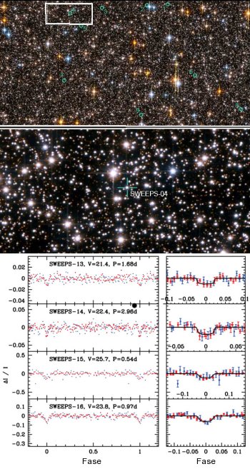 Em cima: imagem de metade do campo de estrelas observado pelo SWEEPS, chamado Janela do Sagitário. Crédito: NASA, ESA, K. Sahu (STScI) & SWEEPS Science Team. Em baixo: curva de luz para 4 dos 16 candidatos descobertos com o SWEEPS. Os gráficos da esquerda mostram a curva de luz para o período orbital determinado; os gráficos da direita mostram em pormenor a curva de luz durante o trânsito. A azul são os dados na banda V, a vermelho na banda I. Crédito: Sahul et al. 2006.