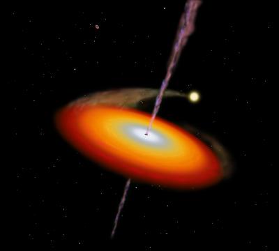 , vai transferindo gás de uma forma constante para o outro objecto, um buraco negro. Este gás forma um disco de acreçãoO Sol é a estrela nossa vizinha, que se encontra no centro do Sistema Solar. Trata-se de uma estrela anã adulta (dita da sequência principal) de classe espectral G. A temperatura na sua superfície é aproximadamente 5800 graus centígrados e o seu raio atinge os 700 mil quilómetros.