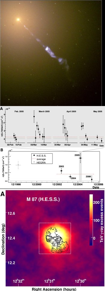 Em cima: imagem da radiogaláxia M87 em luz visível. A região central, a partir da qual são vistos os raios gama de EMA, está situada no canto superior esquerdo da imagem e o jacto relativístico de plasma estende-se até ao canto inferior direito. Crédito: Hubble Space Telescope (HST). Em cima: a variação nos raios gama de EMA emitidos pela M87 - painel inferior: intensidade ano a ano em função do tempo, vista pela H.E.S.S. (e pela HEGRA); painel superior: variações noite após noite com picos em escalas temporais de alguns dias, medidos em 2005. Crédito: H.E.S.S. Ao centro: a radiogaláxia M87 vista em energias muito altas pela H.E.S.S. (painel esquerdo (A), escala a cores). A emissão parece estendida mas isso é, contudo, explicado pela precisão da medição dos telescópios. Uma restrição muito mais forte no tamanho da região de emissão pode ser deduzida a partir da variabilidade medida na radiação gama de EMA (ver texto). A linhas negras reflectem a estrutura da M87 em comprimentos de onda de rádio. Painel direito (B): Ampliação do quadrículo ponteado do painel esquerdo. A radiogaláxia M87 vista em comprimentos de onda de rádio, que correspondem a energias 19 ordens de magnitude mais baixas que a radiação gama de EMA. A posição do máximo de emissão de radiação gama de EMA também é dada (a cruz). Crédito: H.E.S.S., e dados de rádio de F.N. Owen et al. (2000).
