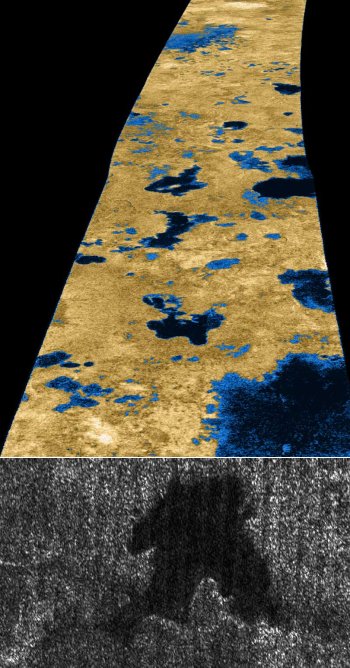 Em cima: esta imagem de radar foi adquirida pelo instrumento de radar da sonda Cassini em modo de abertura sintética, no dia 22 de Julho de 2006. A imagem é de falsa cor e a intensidade é proporcional ao brilho do radar. Os lagos, mais escuros que o terreno à volta, aparecem aqui em intensidades de azul, enquanto as regiões mais brilhantes aparecem em tons de beije. A imagem está centrada a cerca de 80º N, 35º W e tem cerca de 140 km de extensão. Os detalhes menores têm cerca de 500 m de extensão.Em baixo: um dos lagos de Titã, num detalhe de uma imagem de radar obtida pela Cassini a 23 de Setembro de 2006. Vê-se claramente as linhas de costa, baías estreitas e baías largas, lembrando lagos terrestres. Este lago tem cerca de 20 km x 25 km. Créditos: NASA/JPL/USGS.
