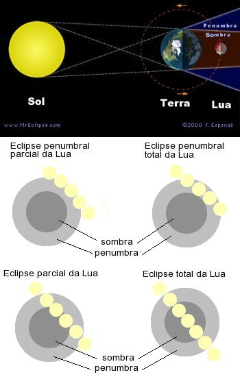 Em cima: esquema que ilustra a geometria que produz a sombra e a penumbra da Terra. Quando a Lua passa pela sombra ou penumbra da Terra, ocorre um eclipse. Crédito: adaptado de F. Espenak (www.MrEclipse.com). Em baixo: ilustração dos diferentes trajectos da Lua quando ocorrem eclipses lunares.
