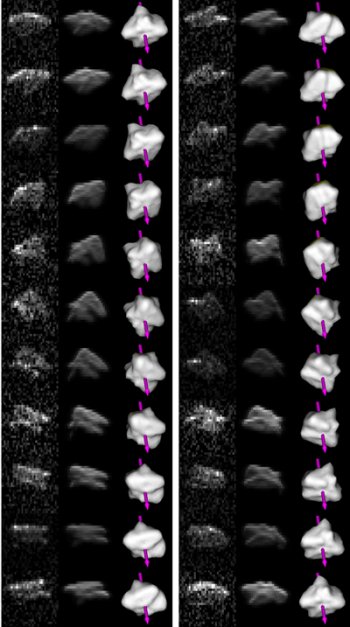 Imagens de radar obtidas pelo radiotelescópio de Arecibo, cobrindo uma rotação completa do asteróide 2000 PH5 (colunas 1 e 4). Nas colunas 2 e 5, encontram-se os correspondentes modelos que melhor se ajustam às imagens. E nas colunas 3 e 6, modelos 3D detalhados da forma do asteróide. Crédito: ESO.