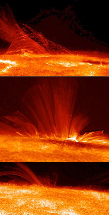 A segunda imagem revela a estrutura do campo magnético solar que se ergue verticalmente numa mancha solar (uma região onde o campo magnético é muito forte). Na borda da mancha solar, as linhas do campo magnético dobram-se para fazerem a conexão com o campo de polaridade oposta.