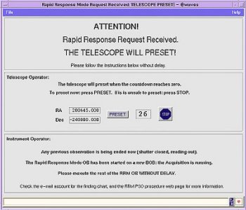 Mensagem de alarme que aparece na consola do computador que controla o telescópio Kueyen quando o modo de resposta rápida do VLT é accionado. Os astrónomos que estiverem a observar só terão de alinhar a ranhura do espectrógrafo para que as observações comecem. Todo o procedimento é efectuado em poucos minutos. Crédito: ESO.
