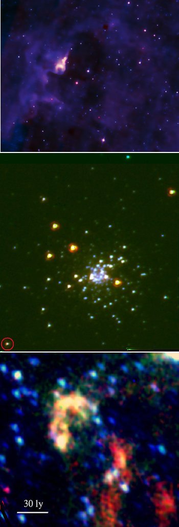 Em cima: imagem da região à volta do berçário de estrelas IC4954/4955 obtida pelo AKARI, resultando da composição de observações a 9 e 19 µm. O berçário é a região brilhante; as estrelas brancas são estrelas que emitem no infravermelho. Aqui vemos o ciclo da formação de estrelas em três gerações, em escalas espaciais de um a cem anos-luz, no infravermelho. Ao centro: esta imagem mostra o enxame globular NGC104 (também conhecido por 47 Tuc) no qual se descobriram evidências de perda de massa intensa por estrelas gigantes vermelhas jovens. Em baixo: esta imagem representa a primeira observação no infravermelho de um remanescente de supernova na Pequena Nuvem de Magalhães. Crédito: JAXA.