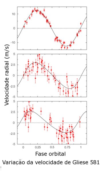 Os painéis mostram as medições da variação da velocidade de cada um dos três planetas que orbitam Gliese 581 e a respectiva curva determinada pelas observações. O painel do topo refere-se ao planeta de 15 massas terrestres (o mais próximo da estrela), o segundo, ao planeta com 5 massas terrestres que se encontra na zona habitável, e o último painel mostra as evidências de um terceiro planeta, com 8 massas terrestres e um período de 84 dias. Crédito: ESO.