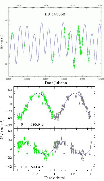 . O outro planeta orbita a HD 155358 em 530 dias à distância de 1,2 UA e tem no mínimo metade da massa de Júpiter.