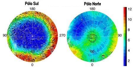 Nestes mapas dos pólos de Marte em falsa cor, o azul escuro indica solo rico em hidrogénio. O pólo Sul está rodeado de terreno gelado. O pólo Norte também contém água em forma de gelo, mas encontra-se escondida debaixo de uma camada de dióxido de carbono gelado por ser inverno no hemisfério Norte. Crédito: NASA.