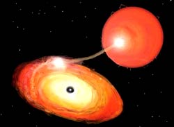 . A energia orbital da estrela é lentamente transferida para a estrela de neutrões que roda cada vez mais depressa. Quando o material da estrela companheira é canalizado em direcção aos pólos magnéticos da estrela de neutrões, surgem os chamados "pontos quentes", que emitem grandes quantidades de raios XDisco composto por gás e poeira interestelares que pode circundar buracos negros, estrelas de neutrões, variáveis cataclísmicas, ou estrelas em formação.