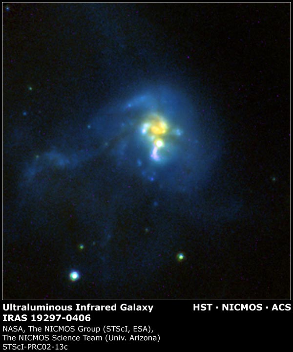 A imagem da IRAS 19297-0406 é uma composição de fotografias a diferentes comprimentos de onda: infravermelho próximo (obtida pela câmara NICMOS) e no óptico/ultravioleta próximo (obtida pela câmara ACS). Crédito: NASA, NICMOS Group (STScI, ESA), & NICMOS Science Team (Universidade do Arizona).