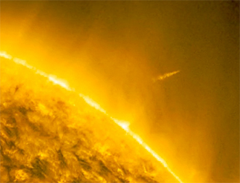 , naquela que seria a sua viagem final, apenas para reaparecer do outro lado aparentemente ileso! Sobrevivendo a esta odisseia, o Lovejoy voltou ao Sistema SolarO Sol é a estrela nossa vizinha, que se encontra no centro do Sistema Solar. Trata-se de uma estrela anã adulta (dita da sequência principal) de classe espectral G. A temperatura na sua superfície é aproximadamente 5800 graus centígrados e o seu raio atinge os 700 mil quilómetros.
