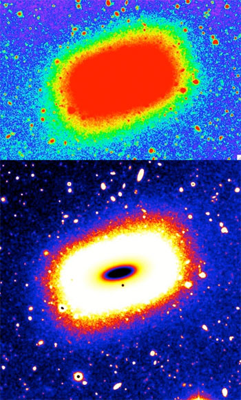 Em cima: LEDA 074886: uma galáxia anã com uma curiosa forma rectangular. Em baixo: imagem de cor falsa de LEDA 074886 obtida com a Suprime-Cam do telescópio Subaru. Contraste forçado para mostrar a estrutura do disco central. (Graham et al.). Créditos: Swinburne University of Technology
