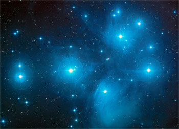 Uma imagem das Plêiades (M45), um enxame de estrelas famoso com cerca de 135 milhões de anos. Esta idade significa que algumas das estrelas de grande massa do enxame explodiram como supernovas quando os amonites ainda existiam em grande número no mar. De acordo com Henrik Svensmark, a taxa de supernovas próximas influenciou fortemente a diversidade destes invertebrados marinhos. Crédito: NASA, ESA e AURA / Caltech
