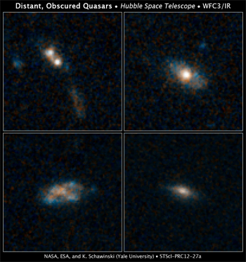 As galáxias nestas quatro imagens do Telescópio Espacial Hubble estão rodeadas por tanta poeira que a luz brilhante dos seus quasares está obscurecida. As imagens no canto superior direito, inferior esquerdo e inferior direito revelam três das galáxias do estudo com aparência normal que hospedam quasares. Apenas uma galáxia na amostra, no canto superior esquerdo, mostra evidências de uma interacção com outra galáxia. As duas bolhas brancas são os núcleos de ambas as galáxias. Observa-se uma franja de material, de cor castanha e azul, abaixo das galáxias que se fundem. As galáxias existiram cerca de 8.000 a 12.000 milhões de anos atrás, durante uma época de pico no crescimento de buracos negros. Têm massas comparáveis à da nossa Via Láctea. As manchas azuis são regiões de formação estelar. As áreas castanhas representam poeira ou estrelas velhas. Crédito: NASA, ESA, e K. Schawinski (Yale University)