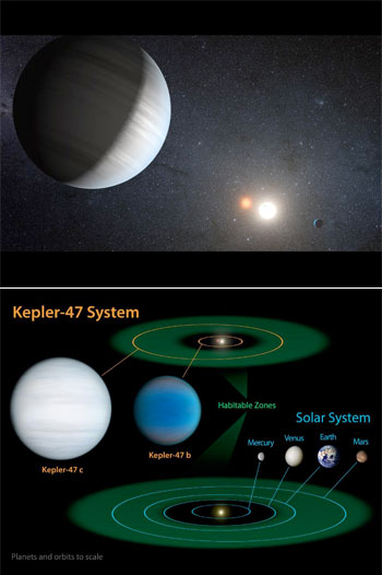 Em cima: Concepção artística do sistema Kepler-47. Em baixo: Diagrama que compara o nosso Sistema Solar a Kepler-47, um sistema com duas estrelas, contendo dois planetas, um deles em órbita na chamada \"zona habitável\" (a verde). Credito das imagens: NASA/JPL-Caltech/T. Pyle