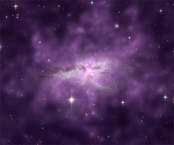 Na nova imagem composta de NGC 6240 os raios-X do Chandra que revelam a nuvem de gás quente surgem a roxo. Estes dados foram combinados com dados ópticos do telescópio espacial Hubble, que mostram as longas caudas de maré das galáxias que se fundem, estendendo-se para a direita e para baixo na imagem. Credito: X-ray (NASA/CXC/SAO/E.Nardini et al); Optical (NASA/STScI).