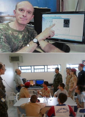Em cima: O Prof. Gentil Bruscato, um dos orientadores do grupo de alunos do CMPA. Em baixo: O Clube de Astronomia do Colégio Militar de Porto Alegre. Crédito: CMPA.
