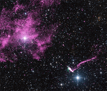 de vento de pulsar, ou PWN (pulsar wind nebula), já havia sido observada anteriormente, mas os dados do Chandra mostram que o longo jacto e a nebulosa são quase perpendiculares entre si.